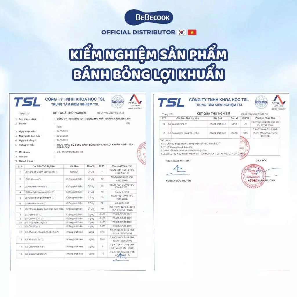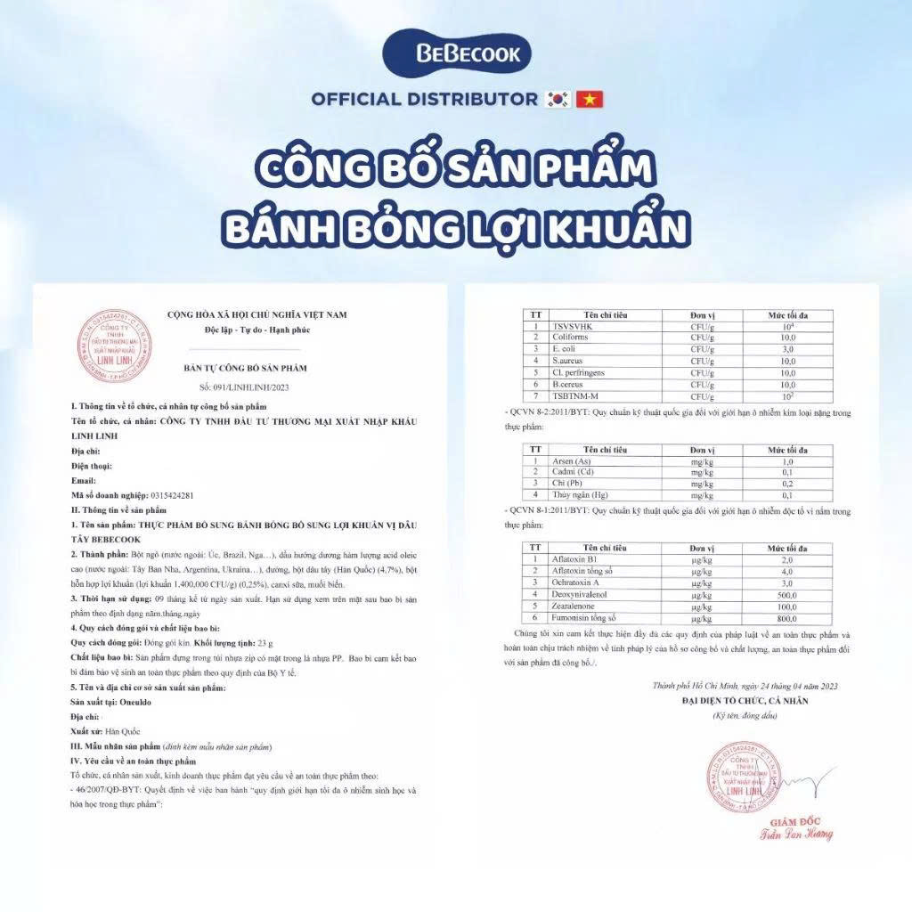- Bánh bỏng lợi khuẩn ăn dặm cho bé BeBecook có thành phần bột lợi khuẩn bổ sung thêm 30 triệu lợi khuẩn trong mỗi túi bánh 23gr nhằm thúc đẩy nhu động hệ tiêu hóa của trẻ