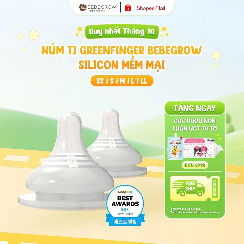 - Tên sản phẩm: Núm ti Greenfinger Bebegrow silicon mềm mại có hai van thoát khí giúp bé bú thoải mái SS/S/M/L/LL