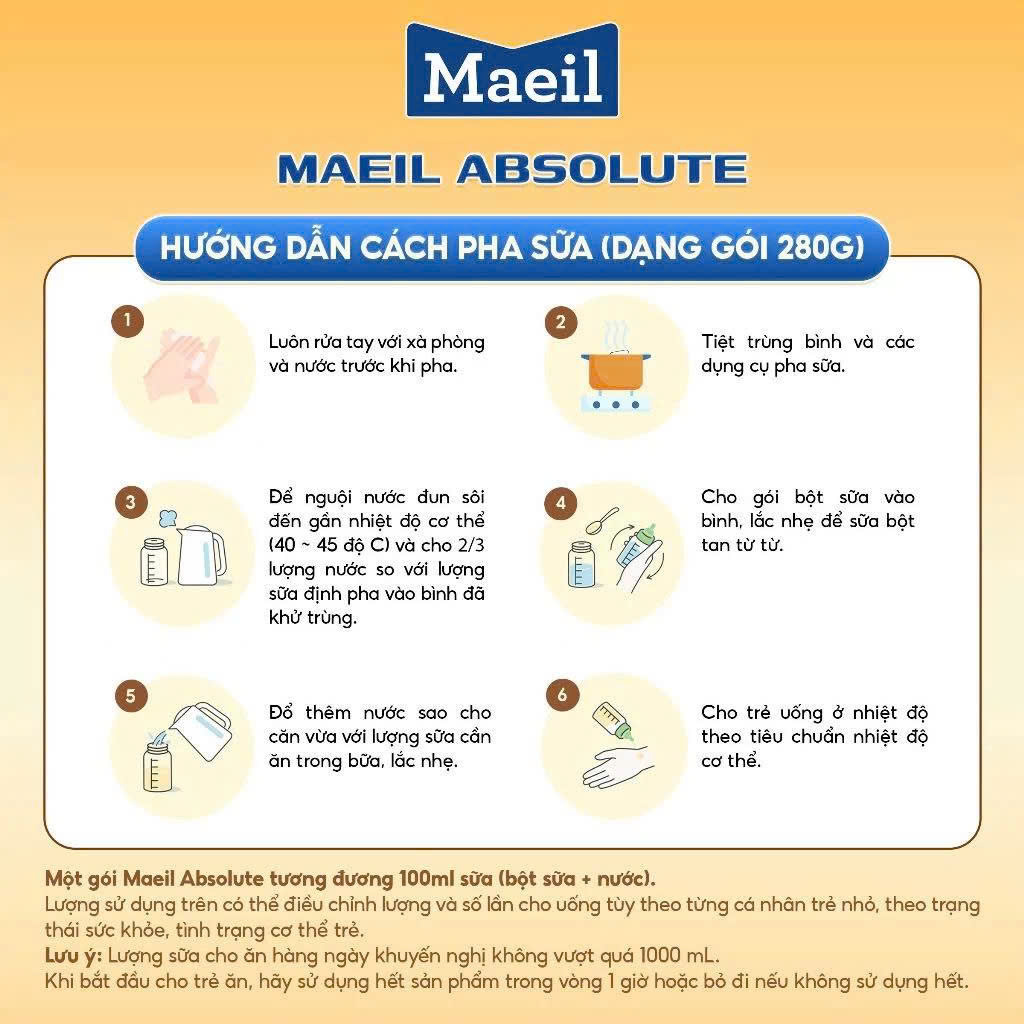Luôn rửa tay với xà phòng và nước trước khi pha và tiệt trùng bình và các dụng cụ pha sữa bột công thức Maeil Absolute