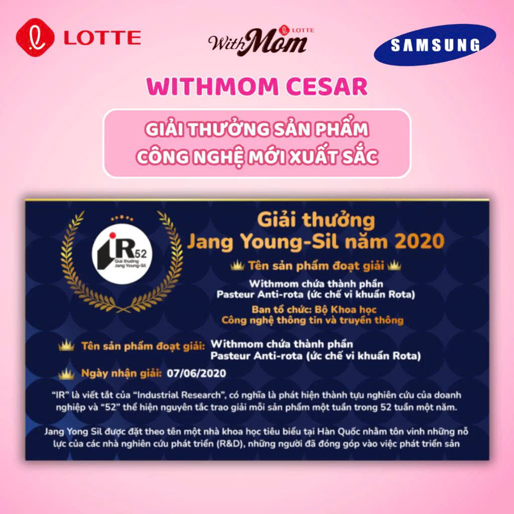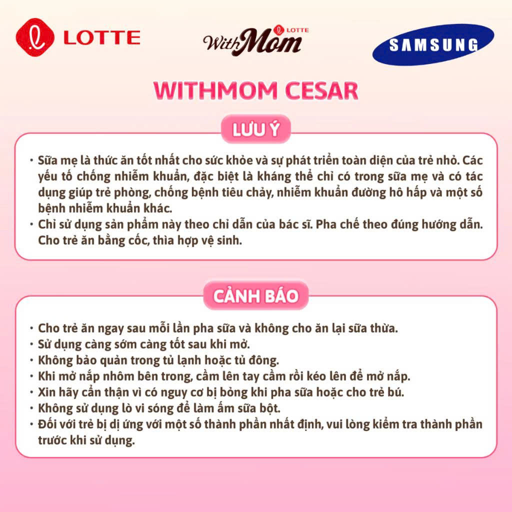 - Nguồn gốc: Sữa bột công thức cho bé Withmom Cesar là sản phẩm được nghiên cứu và phát triển bởi Tập đoàn Lotte và Bệnh viện Samsung Seoul Hàn Quốc