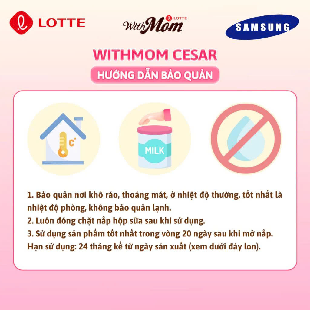 Bảo quản sữa bột công thức cho bé Withmom Cesar ở nhiệt độ thường, nơi khô ráo, thoáng mát, tránh ánh sáng. Sữa công thức Withmom Cesar có nguyên cơ bị hư hỏng sau khi mở nắp nên chỉ sử dụng trong vòng 20 ngày và không bảo quản lạnh